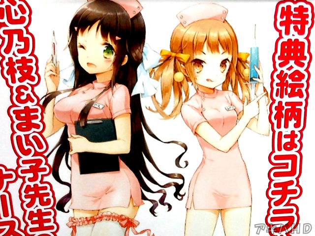 TVアニメの放送も開始された「この中に1人、妹がいる!」のBD/DVD第1巻が発売予定だが、幾つかの店舗で全巻購入特典が告知されていた。特典は、ディスクファイル、全巻収納BOXなどとなっており、CUTEG氏による描き下ろしイラストだったが、ナースコス、スク水姿、女教師コスとなっていた。 |
