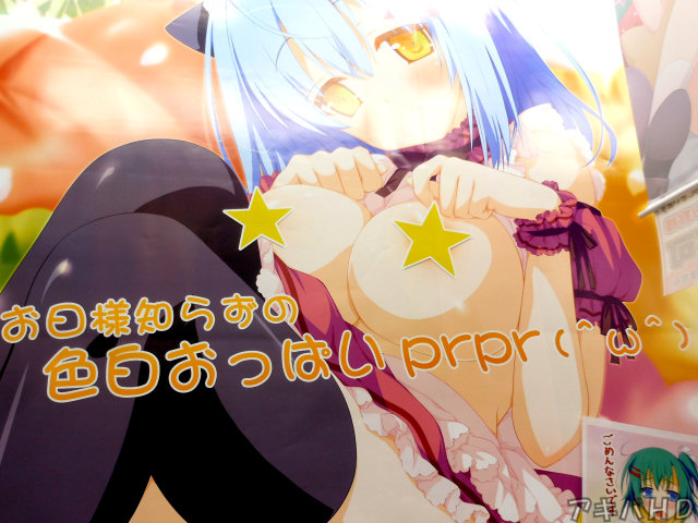 「いろとりどりのヒカリ」のトレーダー特典のサンプルが展示されていた。特典は、描き下ろしB2タペストリーで、ネコ耳メイド姿の敷島鏡が描かれており、たくし上げておっぱいをポロリしていた。他にも、特典のイラストが描かれたデカいポスターもあり『お日様知らずの色白おっぱいprpr(^ω^)』。 |
