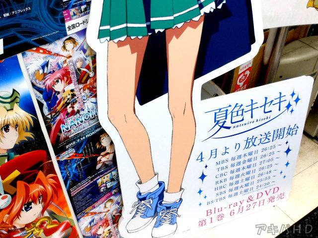 TVアニメが放送中の「夏色キセキ」に登場する女子中学生4人がそれぞれ描かれているパネルが設置されていた。スフィアが主演を務めているオリジナルアニメで、パネルでは制服姿でそれぞれ黒スト、ニーソ、ソックス、三つ折り靴下を穿いており、太モモも見えてた。 |