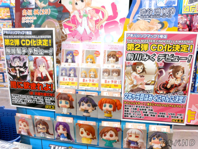 先日「アイドルマスターシンデレラガールズ」のCDが発売されたが、第2弾の発売が決定したらしく、アキバ☆ソフマップ1号店で告知が出ていた。告知にあったのは神崎蘭子と前川みくで『闇に飲まれよ!(訳:お疲れ様です!)』『みくにゃんキター!!俺もにゃんにゃんにゃんにゃん!!』。 |