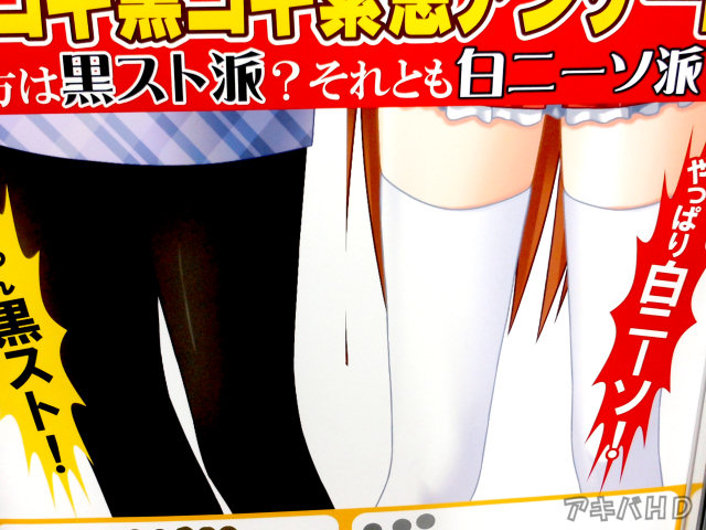 エロゲ「白コキ黒コキ」の「緊急アンケート」が設置されていた。アンケートでは『貴方は黒スト派?それとも白ニーソ派?』などとあり、黒ストか白ニーソのうち好きな方に投票するようになっていた他、本物の黒ストや白ニーソも展示。『黒スト最高!』『白ニーソたまらん!』などのPOPがあった。 |