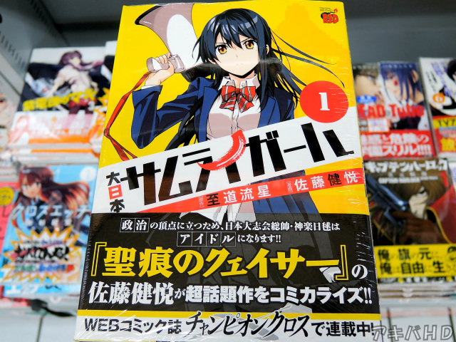 チャンピオンREDいちごに掲載(休刊後はWEBコミック・チャンピオンクロスで配信)の「大日本サムライガール」1巻が1月20日発売。原作は至道流星氏のノベルで、漫画は佐藤健悦氏。オビは『政治の頂点に立つため、日本大志会総帥・神楽日毬はアイドルになります!!』など。