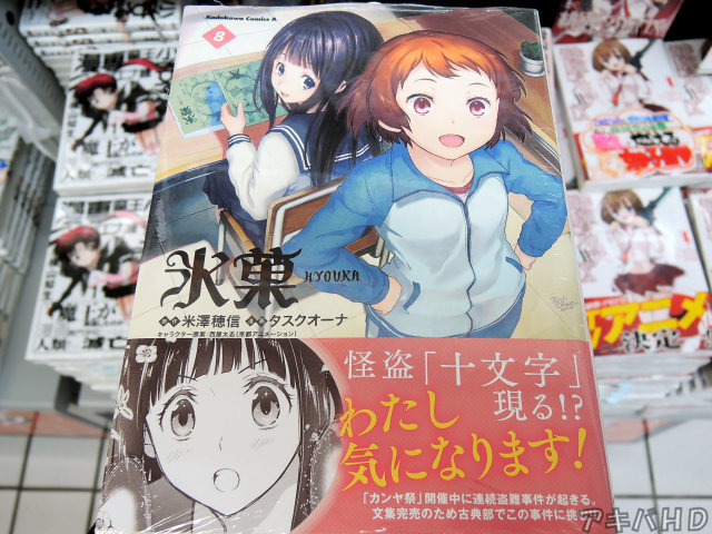 少年エースに連載中の「氷菓」8巻が1月26日に発売。TVアニメも放送された米澤穂信氏による小説のコミック版で、作画はタスクオーナ氏。オビは『「カンヤ祭」開催中に連続盗難事件が起きる』など。とらのあなにあったPOPは『次々とモノが盗まれる怪盗十文字を追え!!!』。 |